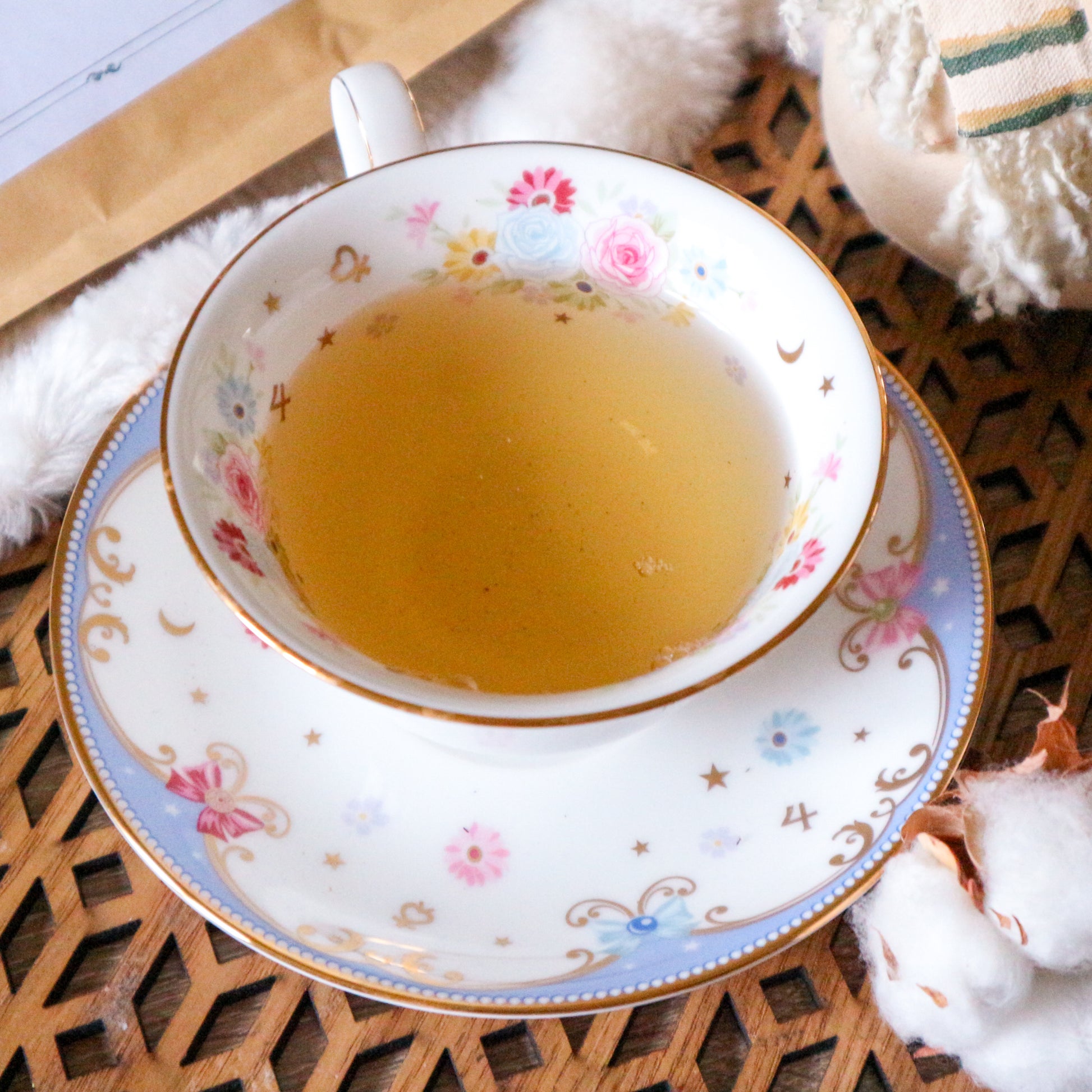 Ingrédients : Thé vert China Jasmin, cannelle, basilic, ortie, racine de réglisse, gingembre, hibiscus, camomille, menthe, clou de girofle, cardamome, poivre noir, pétales de rose, feuilles de framboisier, jasmin.